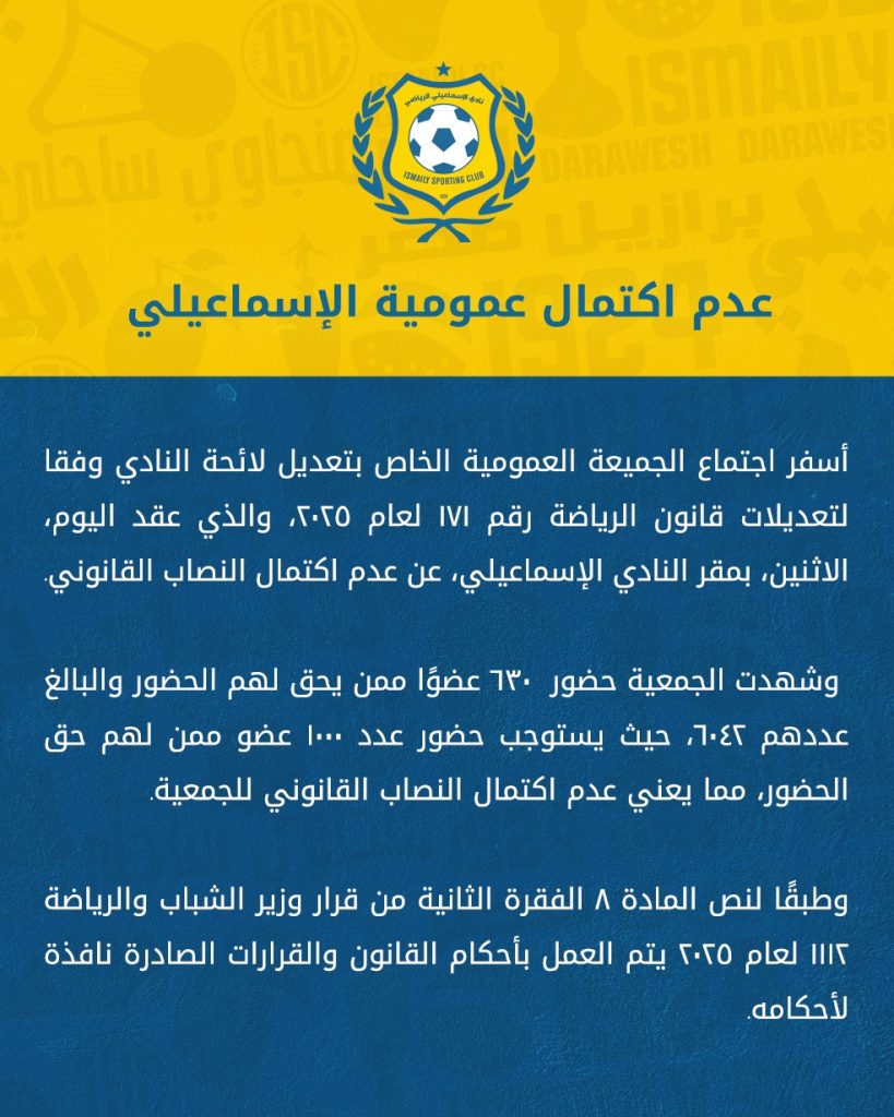 أسفر اجتماع الجميعة العمومية الخاص بتعديل لائحة النادي الإسماعيلي وفقا لتعديلات قانون الرياضة رقم ١٧١ لعام ٢٠٢٥، والذي عقد اليوم الاثنين، بمقر النادي الإسماعيلي، عن عدم اكتمال النصاب القانوني.
