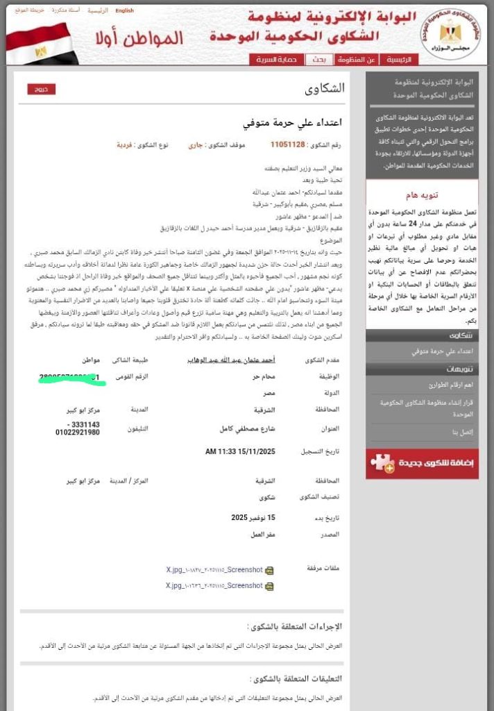 تقدم المحامي أحمد عثمان بشكوى رسمية إلى وزارة التربية والتعليم ضد مظهر شاهين، مدير إحدى المدارس بمحافظة الشرقية، متهما إياه بـ “الاعتداء على حرمة المتوفي” إثر ما وصفه بردود فعل مسيئة وشماتة في وفاة كابتن الزمالك الراحل محمد صبري.